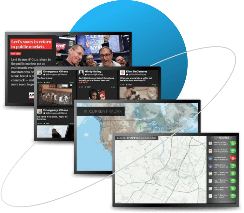 You can publish videos, images, social feeds, dashboards, HTML5, and more—supporting rich, interactive, and targeted digital signage experiences.